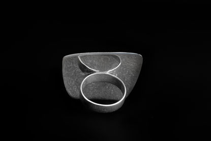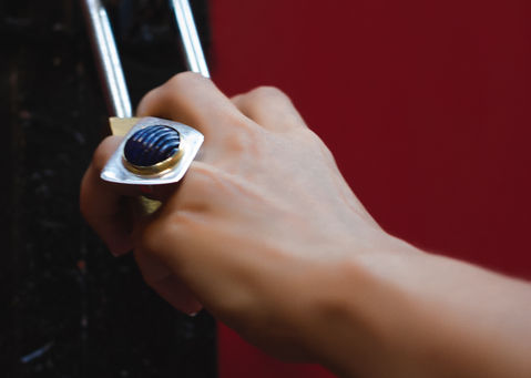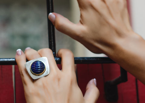 The interplay between the geometric shapes, a trapezium silver platform against the round 18k yellow gold bezel, is a puckish approach to art structures. Linear surfaces versus encircling shapes originate architectural images that intensify the prevailing role of the fascinating lapis lazuli over the entire creation.