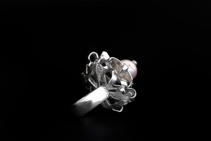 The distinctive controversial design of this hefty kinky ring deploys the random unfurling of fabricated limestone formations to reveal the entrancement of a flamboyant jewel with delicate yet impressive details. The abstract nest formed by disordered creased signature LdL logo motifs is crowned with a silver rose freshwater pearl, the top of which is enlivened by a blue topaz.