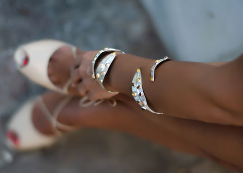 The bangle bracelets are designed to be worn together embellishing with an irresistible imaginative jewel the wrist.